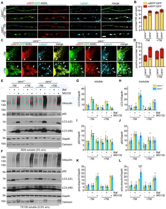 Absence of calnexin causes enhanced ER-phagy and protein degradation by default. (A) Calnexin depletion results in an increase in Lamp1+mRFP+GFP+ vesicles in the axons of primary MNs under basal conditions. Scale bar: 5 µm. mRFP-GFP-KDEL expressing MNs were cultured for 5 days and treated with tunicamycin for 1 h or left untreated. TM, Tunicamycin. (B) Quantification of mRFP+GFP− and mRFP+GFP+ punctae in axons of primary MNs treated with tunicamycin for 1 h or left untreated. At least 15 neurons were analyzed per experiment. Two-way ANOVA, Tukey’s multiple comparisons test. (C) In the somata of cultured MNs, the loss of calnexin resulted in an increase in Lamp1+mRFP+GFP+ and Lamp1+mRFP+GFP− vesicles under basal conditions. Arrowheads point to mRFP+GFP+ punctae. mRFP-GFP-KDEL expressing MNs were cultured for 5 days and treated with tunicamycin for 1 h or left untreated. TM, Tunicamycin. Scale bar: 2.5 µm. (D) Quantification of mRFP+GFP− and mRFP+GFP+ punctae in the somata of primary MNs treated with tunicamycin for 1 h or left untreated. At least 15 neurons were analyzed per experiment. Two-way ANOVA, Tukey’s multiple comparisons test. (E,F) Western blot showing the insoluble (E) and soluble (F) protein levels of LC3, p62, and polyubiquitinated proteins. Wildtype and calnexin-deficient early cortical neurons were treated as indicated and subjected to the fractionation procedure. (G–L) Quantification of the LC3-II levels in the TX100-soluble (G) and SDS-soluble (H) fraction. Quantification of the p62 levels in the TX100-soluble (I) and SDS-soluble (J) fractions. Quantification of the polyubiquitinated protein levels in the TX100-soluble (K) and SDS-soluble (L) fractions. The protein levels were normalized to Gapdh in the soluble fraction. Three-independent experiments. n = 3. All data in Figure 2 are shown as the mean ± SEM. * p < 0.05, ** p < 0.01, *** p < 0.001.