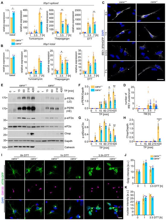 Upon chemical UPR induction, all reagents induced a marked increase in the Xbp1s levels, albeit with different kinetics (Figure 3A). Whereas tunicamycin gave a slower response, the response to DTT and thapsigargin was more rapid, reflected by a faster splicing of Xbp1. Depletion of calnexin resulted in significantly reduced Xbp1s levels after 3.5 h of thapsigargin exposure and 7 h of DTT or tunicamycin exposure (Figure 3A). Chemically induced ER stress also resulted in an upregulation of Xbp1t, albeit less dramatic than the induction of Xbp1s. In calnexin-deficient cells, we also observed a significantly reduced expression of Xbp1t after 3.5 h of thapsigargin exposure (Figure 3B). To analyze whether the reduced expression of Xbp1s in calnexin-deficient cells resulted from impaired IRE1α activation, we expressed IRE1α-3F6H-GFP in wildtype and calnexin-deficient early cortical neurons and treated the cells with tunicamycin to induce ER stress. Upon activation, IRE1α oligomerized, reflected by dynamic clustering [39]. Therefore, we analyzed the clustering of IRE1α in wildtype and calnexin-deficient early cortical neurons after 1 h, 3.5 h, and 7 h of tunicamycin exposure (Figure 3C,D). In untreated cells and 1 h after the treatment with tunicamycin, IRE1α was evenly distributed in an ER-like pattern. After 3 h and 7 h of tunicamycin exposure, IRE1α appeared in a clustered pattern, which indicated its dimerization and activation. In calnexin-deficient cells, we observed a clear reduction in IRE1α clusters 3 h and 7 h after exposure to tunicamycin (Figure 3D). In summary, these results suggest that the full activation of IRE1α upon ER stress requires calnexin, leading to reduced levels of Xbp1s under ER stress conditions in calnexin-deficient cells.