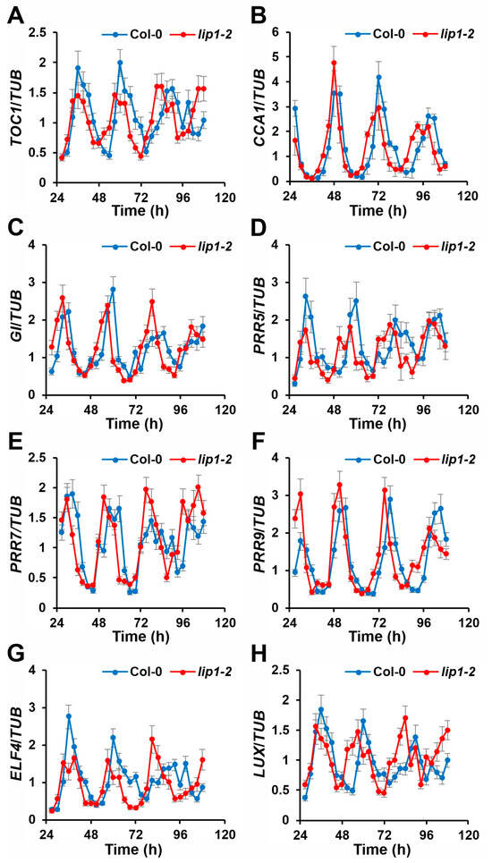 mRNA accumulation pattern of clock genes in the lip1-2 mutant. Wild-type (Col-0) and lip1-2 mutant seedlings were grown in 12 h light/12 h dark photocycles for 7 days and transferred to continuous red light (5 µmol m−2 s−1). Samples were harvested at 3 h intervals, starting 27 h after the transfer. mRNA levels of TOC1 (A), CCA1 (B), GI (C), PRR5 (D), PRR7 (E), PRR9 (F), ELF4 (G), and LUX (H) were determined by qPCR and normalised to the corresponding TUBULIN 2/3 (TUB) mRNA levels. Average values of 3 independent replicates are plotted, error bars represent standard error values.