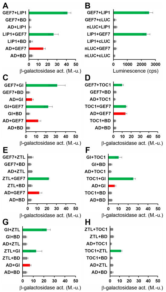 Identification of proteins directly or indirectly interacting with LIP1. Full-length LIP1, GEF7, GI, TOC1 and ZTL proteins fused to the transcriptional activation domain (AD) or the DNA-binding domain (BD) of the GAL4 transcription factor were co-expressed in yeast (PJ69-4A) cells (A,C–H). Pairwise interactions were tested in either (AD and BD) configurations. For each combination, the first or the second indicated protein carried the AD or the BD fusion tag, respectively. AD and BD correspond to controls, where these GAL4 derivatives were expressed without foreign fusion partners. β-galactosidase activity, reporting the activation of the lacZ marker and therefore the strength of interaction between the two given fusion proteins, was determined from liquid-cultured transformant cells. Green bars indicate activation above the background levels (grey bars). GEF7 and GI fused to BD were able to activate the marker gene without any interacting partners (transactivation, red bars). The assays were repeated 3–4 times with essentially the same results. Error bars represent standard error values of 3 technical repeats of a representative assay. M.-u.: Miller-units. The interaction between LIP1 and GEF7 was also tested by luciferase complementation assays (B). LIP1 or GEF7 fused to the N- or C-terminal fragment of firefly luciferase (nLUC or cLUC) in either configuration were coexpressed in E. coli BL21 Rosetta cells along with the corresponding controls. Luminesce of freshly grown bacterial cultures was detected in a luminometer. Error bars represent the standard error values of 3 independent assays. cps: counts per second.