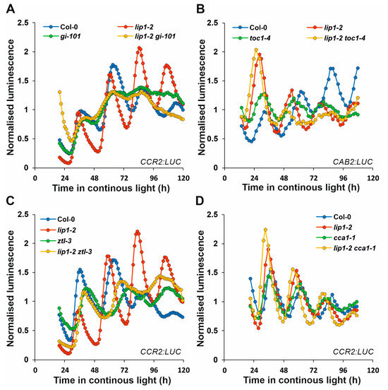 The Columbia-0 (Col-0) accession of Arabidopsis (Arabidopsis thaliana) was used as the background for all the experimental lines. The mutant lines used here have been described earlier: lip1-2 [23], toc1-4 [25,26], ztl-3 [27], cca1-1 [28] (Ws background back-crossed with Col-0 five times). The gi-101 allele was identified from the SALK collection (SALK_092757) and ordered from the Eurasian Arabidopsis Stock Centre (uNASC), id: N592757. PCR primers were designed using the T-DNA Primer Design Tool (http://signal.salk.edu/tdnaprimers.2.html (accessed on 11 May 2021.)) and used for allele-specific genotyping. Primer sequences are shown in Supplementary Table S1. The CCR2:LUC marker was introgressed from a transgenic Col-0 line [29] to lip1-2. The resulting lip1-2 CCR2:LUC line was crossed to ztl-3, cca1-1 and gi-101. The wild type, the single and the double mutants were all selected from the corresponding F2 segregating populations. The toc-4 line carried a CAB2:LUC reporter, which was introgressed in lip1-2 by crossing. Again, the wild type, the two single mutants and the double mutant were selected from the F2 population. This protocol ensured the homogenous genetic background of the lines (except for the lip1-2 and the clock gene mutations, of course) that had to be assessed for clock function.