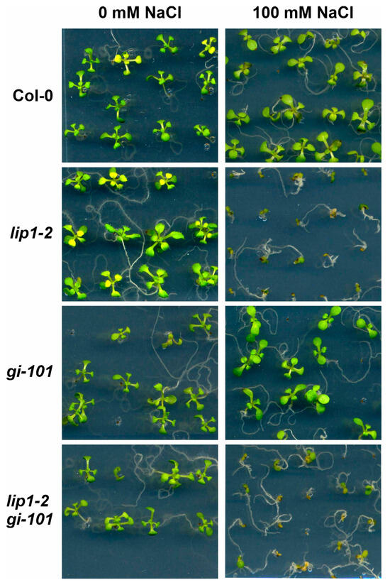 Impaired development of lip1-2 and lip1-2 gi-101 mutants in high salinity conditions. Col-0, lip1-2, gi-101 and lip1-2 gi-101 seedlings were grown in 12 h light/12 h dark photocycles for 14 days on media with or without 100 mM NaCl.