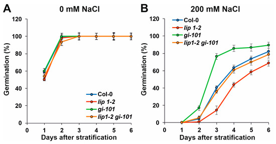 Additive effects of lip1-2 and gi-101 mutations on salt stress responses of germination. Col-0, lip1-2, gi-101 and lip1-2 gi-101 seedlings were grown in 12 h light/12 h dark photocycles on media with (B) or without (A) 200 mM NaCl. The number of seedlings with emerged radicles were counted daily and expressed as the percentage of the total number of seeds. Error bars represent standard error (SE) values, n = 48−72.