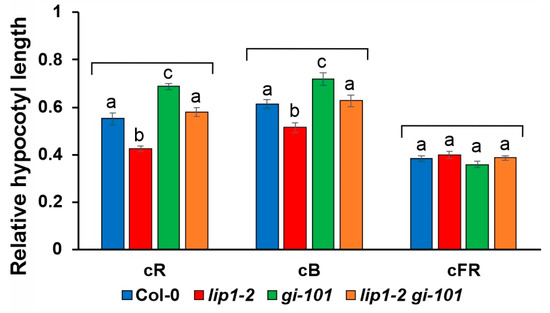 LIP1 affects photomorphogenic responses independently of GI. Wild-type Col-0, lip1-2, gi-101 and lip1-2 gi-101 mutant seedlings were grown in continuous red (cR, 20 µmol m−2 s−1), blue (cB, 2 µmol m−2 s−1) or far-red (cFR, 1 µmol m−2 s−1) light for 4 days. Hypocotyl lengths were measured and normalised to the corresponding dark-grown hypocotyl lengths. A total of 30–40 seedlings were analysed for each genotype and light condition. Error bars indicate standard error (SE), and different letters show significant differences at p < 0.05 (Duncan’s test).