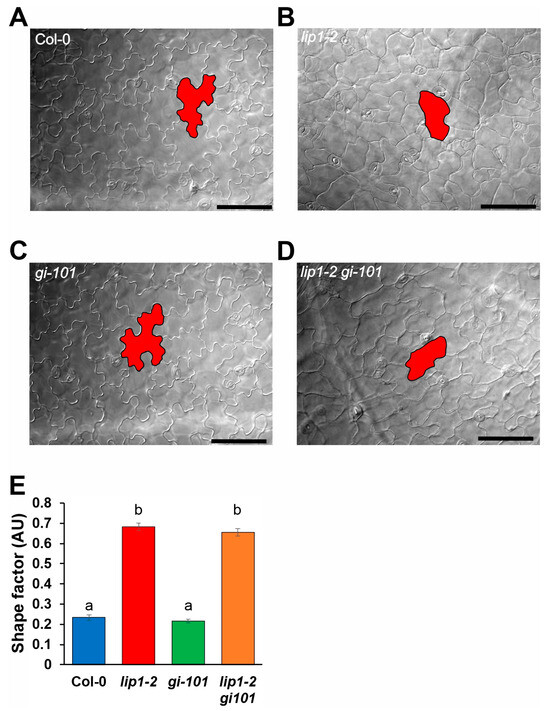 The pavement cell morphology phenotype of lip1-2 mutants is independent of GI. Pavement cell morphology of Col-0 (A), lip1-2 (B), gi-101 (C) and lip1-2 gi-101 (D) plants grown in 12 h light: 12 h dark photocycles for 8 days. Representative cells are outlined with black and filled with red colours to aid visualisation. Scale bars: 100 µm. (E) Cell shape factor values were calculated from the area and the perimeter of cotyledon pavement cells. n = 34−45, Error bars indicate standard error, and different letters show significant differences at p < 0.01 (Duncan’s test).