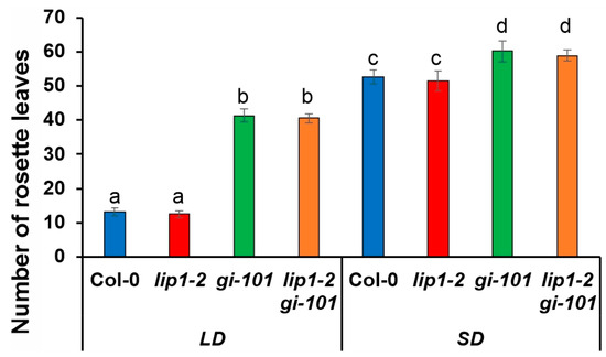 GI is a key player of photoperiodic flowering upregulating FT transcription by CO-dependent [20] and CO-independent [41] routes. Accordingly, flowering is dramatically delayed in loss-of-function gi mutants. Owing to the lack of information on the flowering phenotype of lip1-2 mutants, plants of the different genotypes were grown in short-day (8 h light/16 h dark, SD) or long-day (16 h light/8 h dark, LD) conditions. The time of flowering was determined as the number of rosette leaves at bolting. Figure 8 demonstrates that flowering time was not altered in the lip1-2 mutant in either condition. The gi-101 single flowered later than the wild type, whereas the lip1-2 gi-101 double was indistinguishable from the gi-101 single.