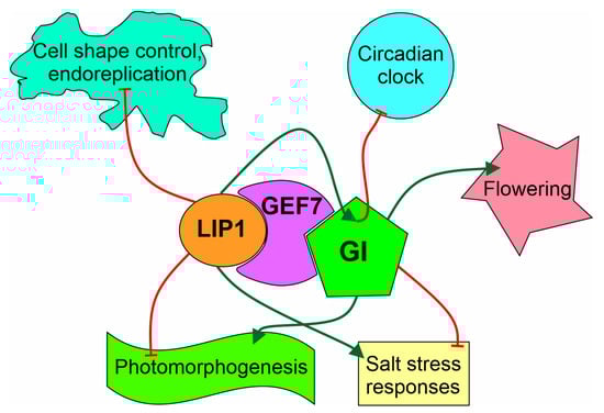 In summary, we demonstrated that (i) LIP1 affects the circadian clock via selectively affecting a specific function of GI and (ii) regulates salt stress and photomorphogenic responses by GI-independent routes, (iii) but does not affect the photoperiodic pathway of flowering initiation.