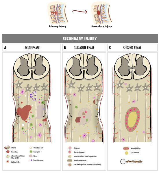 The primary injury initiates a secondary injury that inflicts additional chemical and mechanical damage on spinal tissues, resulting in neuronal excitotoxicity due to elevated calcium accumulation, increased reactive oxygen concentrations, and heightened glutamate levels. These events cause damage to underlying nucleic acids, proteins, and phospholipids, ultimately resulting in neurological dysfunction [26]. The secondary injury phase unfolds in three distinct phases: acute, sub-acute, and chronic. In the acute phase, clinical manifestations of secondary injury include increased cell permeability, ischemia, vascular damage, edema, excitotoxicity, ionic deregulation, inflammation, and free radical formation [22,27]. If the acute secondary injury persists, the sub-acute phase ensues, which is characterized by features such as neuronal apoptosis, axonal demyelination, Wallerian degeneration, and fibroglial scar formation [22,27]. Should the sub-acute secondary injury continue, the chronic phase initiates, leading to cyst formation, axonal dieback, and maturation of the glial scar [22,28]. In the following section, the pathophysiology of each phase is thoroughly discussed.