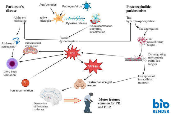 The appearance of iron deposits in post-mortem brain tissue from PD suggests that nigral iron accumulation may choreograph a fundamental role in the destructive pathways (via production of hydroxyl radicals and oxidative stress) of neuromelanin-containing neurons and also in the motor deficits and motor abnormalities [52]. Indeed, it has been suggested that the increase in iron content may correlate with a degree of SN dopaminergic neuronal destruction, which, in turn, impacts the motor deficits/abnormalities in PD [53]. Extrapolation of this concept would imply that parkinsonian-specific neuronal iron localization contributes to the manifestation of selective motor features. However, this notion is challenged by disorders such as PEP. PEP has been reported after viral infections with influenza A virus, West Nile, St. Louis, Varicella zoster, and Japanese B encephalitis viruses [5,54]. It therefore appears that the viral infection subsequently has the propensity to result in the manifestation of parkinsonism. Paradoxically, although PD and PEP share many motor deficits, such as, e.g., bradykinesia, resting tremor, and rigidity, they are quite diverse neuropathologically. The varied neuropathological features in the two disorders range over abnormal accumulation of different proteins, selective loss of neurons, deposition of iron, and other features [8,10].