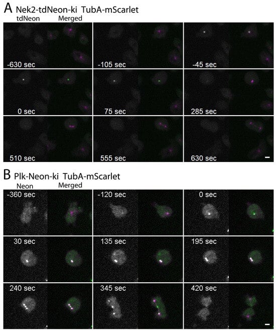 Dynamic behavior of Nek2 and Plk kinases during mitosis. Live cell spinning disk confocal microscopy of Nek2 tdNeon knock-in mScarlet-α-tubulin cells ((A); Video S1) and Plk Neon knock-in mScarlet-α-tubulin cells ((B); Video S2). Selected time points of videos S1 and S2 are shown. Time point zero is defined by microtubule breakdown. Maximum intensity projections of 11 slices per stack (z-distance 0.3 µm). Stacks were recorded every 15 s. First channel = Nek2-tdNeon/Plk-Neon (white); second, merged channel = Nek2-tdNeon/Plk-Neon (green) αTubulin-mScarlet (magenta). Bar = 3 µm.
