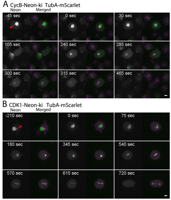Dynamic localization of CycB and CDK1 during mitosis. Live cell spinning disk confocal microscopy of CycB Neon knock-in mScarlet-α-tubulin cells; Arrowhead shows CycB lokalisation at the centrosome in Interphase ((A); Video S3) and CDK1 Neon knock-in mScarlet-α-tubulin cell; Arrowhead shows CDK1 lokalisation at the centrosome in Interphase ((B); Video S4). Selected time points of Videos S3 and S4 are shown. Maximum intensity projections of 11 slices per stack (z-distance 0.3 µm). Stacks were recorded every 15 s. First channel = CycB/CDK1-Neon (white); second, merged channel = CycB/CDK1-Neon (green) αTubulin-mScarlet (magenta). Bar = 3 µm.