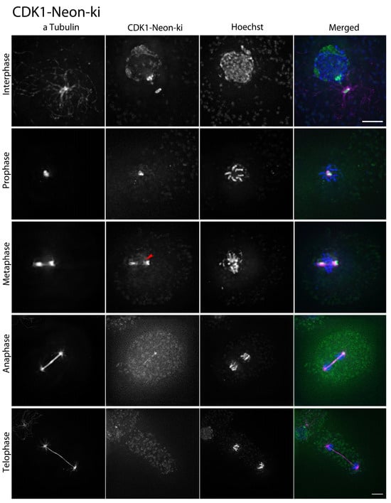 Changes of the CDK1 signal in interphase and during mitosis. Immunofluorescence microscopy of CDK1-Neon knock-in cells fixed with glutaraldehyde stained with anti-α-Tubulin and secondary antibodies anti-rat-AlexaFluor-568; Arrowhead showsa weak localization of CDK1 at centromeres remains until metaphase.Maximum intensity projections of deconvolved images (iterative DCV, measured PSF) are shown. CDK1-Neon signal in (green), α-Tubulin (red), and Hoechst (blue). Bar = 3 µm.