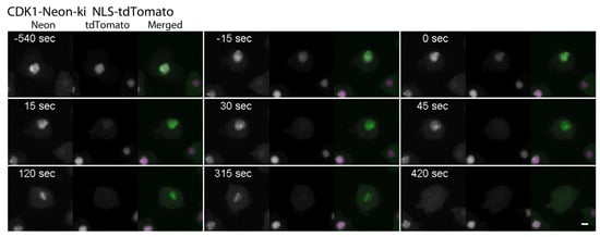 CycB-Neon in fixed cells was distributed in a very similar fashion as CDK1-Neon. Again, prior to mitosis, the nucleolar region and the centromere cluster were labeled within the nucleus, and the centrosome was labeled on the cytoplasmic side of the nucleus (Figure 5). Interestingly, here, CycB-Neon was typically found concentrated in two discrete dots within the microtubule-organizing center, slightly different from the CDK1-Neon distribution. In specimens prepared from unsynchronized cells, CycB-Neon was present at centrosomes in 82 ± 6% (mean ± SD, n = 5) of all cells, i.e., at a slightly higher percentage than CDK1-Neon (77 ± 2%, mean ± SD, n = 5), again suggesting that CDK1 binds to centrosomes shortly after CycB (Supplementary Figure S3). Similarly in animal cells, cyclin B is targeted to centrosomes via its hydrophobic patch and then recruits CDK1 to centrosomes [29]. The live cell observation of CDK1-Neon and CycB-Neon suggested that the disappearance of both proteins from the nuclear interior starts only after permeabilization of the nucleus in prophase, which allows entry of tubulin dimers and spindle assembly factors [17]. To investigate this more closely, we expressed our NLS-tdTomato construct in the CDK1-Neon strain. NLS-tdTomato is a tandem red fluorescent protein with a nuclear localization sequence (NLS) and is an established marker for the permeabilization of the nuclear envelope by partial disassembly of nuclear pore complexes [17,18]. Figure 6 shows clearly that the diffuse intranuclear CDK1-Neon signal starts to disappear clearly after the disappearance of NLS-tdTomato, i.e., the start of permeabilization. This suggests that CDK1 and cyclin B are not dissolved in the nuclear matrix but are associated with nuclear structures, most likely chromatin.