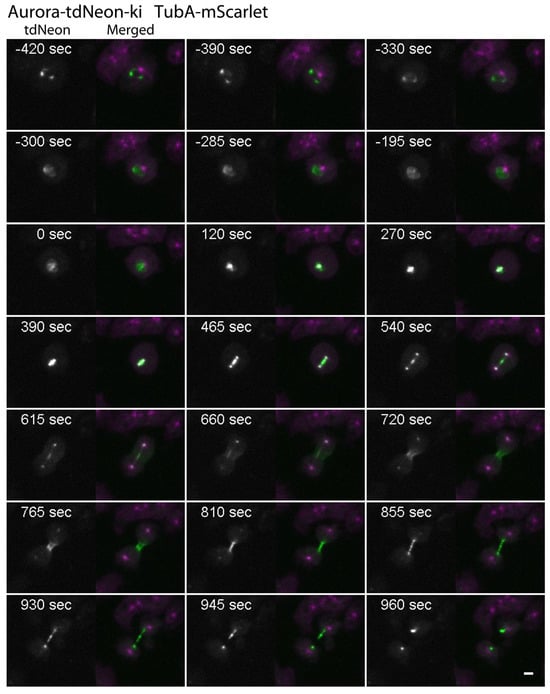 To study the dynamic localization of AurK, it again turned out to be necessary to use the tandem Neon tag, since the fluorescence of AurK-Neon with the single tag was too weak for live cell imaging at a sufficient quality. As for the other kinases, mScarlet-α-tubulin was expressed in the AurK-tdNeon strain. Prior to mitosis, the AurK-tdNeon signal consisted of usually two or three fluorescent spots in the nuclear periphery representing the nucleoli (Figure 7). The signal was redistributed to the centrosome at the G2/M transition prior to the disassembly of the microtubule cytoskeleton (time point 0:00), while some background in the nucleus remained.