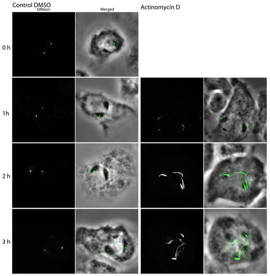 HL5c medium (Formedium, Hunstanton, UK) was supplemented with sterile filtered glucose after autoclaving. Clones were selected after the addition of 4 μg/mL Blasticidin S. For microscopy, cells were grown in adherent culture using tissue culture flasks. For Actinomycin D (AM-D) treatment, cells were allowed to settle for one hour prior to the addition of AM-D (stock solution (20 mg/mL in DMSO) at a final concentration of 100 µg/mL. The treatment was stopped by fixation. Control cells were treated with DMSO at the same concentration.