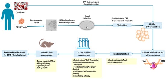 Hematopoietic stem cells (HSCs) can be isolated from cord blood from the umbilical cord and placenta after childbirth and can differentiate into various blood cell types, including T cells. HSCs from cord blood are induced to differentiate into T cells using specific cytokines and growth factors. These T cells are expanded in vitro to achieve the necessary cell numbers for therapy. T cells are genetically modified to express chimeric antigen receptors (CARs) [15].