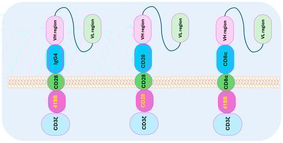 Key components of CAR T-cell design and generation: CD3ς (cluster of differentiation), a component of T-cell co-receptors involved in activation; 41BB (CD137), a co-stimulatory receptor for persistence and survival; CD28, which co-stimulates CAR T cells for a rapid anti-tumor response; CD8α, which decreases activation-induced cell death; IgG4, which improves CAR T-cell targeting.