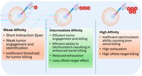 The selection of single-chain variable fragment (scFv) candidates for a particular CAR T cell involves identifying the antibody fragments that exhibit optimal specificity and affinity for the target antigen expressed on cancer cells. This process typically begins with screening a diverse library of antibody sequences to isolate those that bind effectively to the desired antigen. Once potential scFv candidates are identified, they undergo rigorous testing to assess their binding kinetics, stability, and ability to elicit a robust immune response when integrated into the CAR structure. Further optimization may involve engineering the scFv to enhance its binding properties and minimize off-target effects. The ultimate goal is to select an scFv that not only targets the cancer cells with high precision but also contributes to the overall efficacy and safety of the CAR T-cell therapy. Moderate-affinity scFvs are often more optimal for CAR T-cell design because they can effectively engage and disengage from the target antigen. This enhances the CAR T cells’ serial killing ability and reduces off-target effects. (Figure 3).