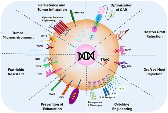 Fratricide resistance in CAR T cells is crucial for therapies targeting T-cell antigens such as CD2, CD5, and CD7. Fratricide occurs when CAR T cells attack each other due to the expression of these target antigens on their own surface. To prevent this, genetic modifications can be employed. Knocking out CD2, CD5, or CD7 in CAR T cells can eliminate the target antigen, preventing self-recognition and fratricidal killing [54,55,56]. This ensures that the engineered CAR T cells can survive, proliferate, and maintain their anti-tumor activity without being compromised by mutual destruction. Such modifications enhance the effectiveness and longevity of CAR T-cell therapies targeting T-cell malignancies.