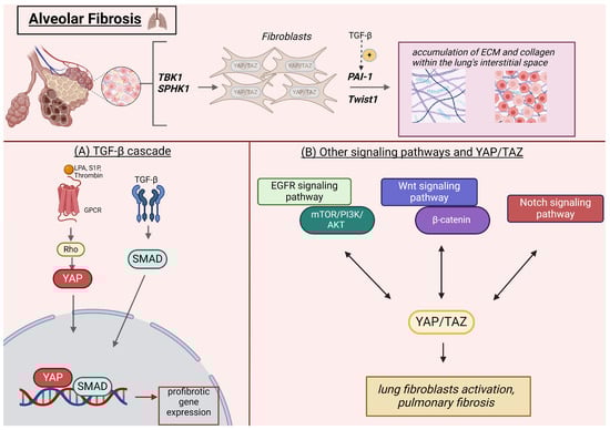 The high mortality rate of PF is strongly associated with the limited therapeutic options available to treat this disease. Pharmacological agents used in the management of IPF patients do not treat the disease but rather decelerate its progression and include nintedanib and pirfenidone [9]. Nintedanib functions as an inhibitor of tyrosine kinases with antifibrotic, anti-inflammatory, and vascular remodeling effects [10]. Pirfenidone is a broad-spectrum antifibrotic drug that inhibits the proliferation of fibroblasts, the production of collagen, and the differentiation of myofibroblasts [11]. However, both nintedanib and pirfenidone have side effects that vary in their impact on different patients, presenting with varying degrees of severity; nintedanib is closely linked to diarrhea and other gastrointestinal symptoms, while pirfenidone is more likely to cause adverse skin reactions, especially photosensitivity, as well as gastrointestinal intolerance, primarily in the form of nausea [12,13,14]. This variability in adverse effects complicates treatment for medical practitioners. So far, the only effective therapy for IPF patients that decreases mortality is lung transplantation [15]. However, lung transplants are not without complications, which further highlights the need for novel therapeutic approaches for PF. Re-examining the molecular landscape behind PF pathophysiology revealed the dysfunction of yes-associated protein (YAP)/transcriptional coactivator with PDZ-binding motif (TAZ) signaling as a major cause of PF. The YAP/TAZ cascade has been identified as a critical regulator of fibroblast activation and ECM synthesis in PF. Activation of the Hippo pathway components YAP and TAZ in alveolar epithelial cells and fibroblasts contributes to lung regeneration and harmful remodeling after injury, with dysregulation of this pathway implicated in the progression of lung fibrosis [16]. The aim of this review is to delve into the role of the YAP/TAZ cascade in the pathogenesis and progression of PF. Therapeutic efforts towards targeting several pathways associated with YAP/TAZ will be reviewed as well.