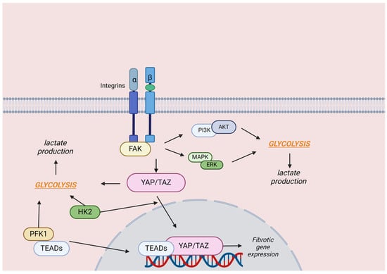 Recently, Yan et al. explored the effect of YAP/TAZ signaling in glycolytic reprogramming in the setting of lung fibrosis [58]. Evidence indicates that IPF patients show metabolic dysregulation of glucose, lipids, hormones, and other metabolites in their lungs [58,59,60]. This dysregulation causes abnormal metabolic product levels, interfering with the homeostatic processes that maintain the pulmonary microenvironment in balance [58,61]. For example, lactate, a glycolytic byproduct, is found in abundance in human IPF lung tissue [58]. Research has demonstrated that glycolysis is enhanced in fibrotic regions of IPF lungs and may be used as a predictive biomarker with respect to lung function decline and mortality [62]. Although data regarding the association of YAP/TAZ with glycolysis is scarce, available evidence indicates that key enzymes involved in glycolysis are upregulated by YAP/TAZ, thus increasing glucose metabolism and intracellular production of lactate [58,63,64]. Furthermore, a study suggests that upstream signaling via integrins/FAK activates the YAP/TAZ pathway, which leads to the regulation of glycolysis [58]. Enhanced glycolysis seems to enable YAP/TAZ entry into the nucleus and induction of gene expression promoting fibrosis. Moreover, in order for YAP/TAZ to enter the nucleus, the presence of the key glycolytic enzyme HK2 is required [65]. Phosphofructokinase-1 (PFK1) is another glycolytic enzyme that appears to be upregulated in activated human lung fibroblasts. Additionally, PFK1 has been shown to bind to TEADs, supporting their interaction with YAP/TAZ, which may explain how this glycolytic enzyme achieves to regulate the differentiation of fibroblasts [66]. Overall, these findings suggest that YAP/TAZ signaling promotes PF progression via reprogramming glycolytic pathways (Figure 2).