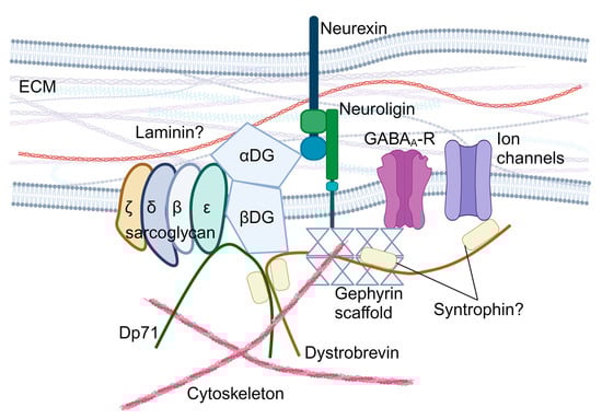Hypothesised role of ε-sarcoglycan in the brain dystroglycan complex. αDG: α-dystroglycan; βDG: β-dystroglycan; DGC: dystroglycan complex; Dp71: dystrophin protein 71; ECM: extracellular matrix; and GABAA-R: GABAA receptors. Created with BioRender.com.