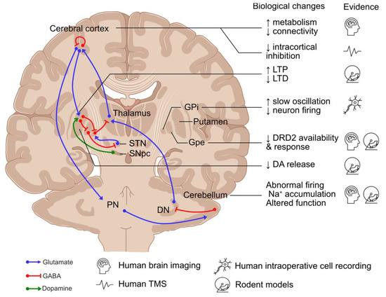 Disruption to the basal ganglia–cerebello-thalamo-cortical circuit has been recognised as a common feature across dystonic disorders [55,56]. Therefore, although this review focuses on MD, this section will discuss the role of these individual regions in the pathogenesis of dystonia (Figure 3).