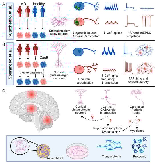 Sperandeo et al. investigated the effects of SGCE mutations on cortical glutamatergic neurons using iPSCs from three patients with SGCE mutations (one with c.771_772delAT, p.C258X mutation and two lines carrying c.622G>A, p.G221A mutation) and their CRISPR-Cas9 corrected isogenic control lines, coupled with an SGCE knock-out human ESC line from the iCas9 line (Figure 5B) [12]. These cell lines were comparable in their differentiation towards cortical glutamatergic neurons, with efficiencies of >50% and consisting of both TBR1+ upper and BCL11B+ deep layer neurons. Bulk RNA-sequencing found that the SGCE knock-out cortical glutamatergic neurons had a higher expression of genes related to axon projection and synaptic organisation and function but a lower expression of genes related to protein transport and cell adhesion and migration. Consistent with these transcriptomic alterations, the mutant cortical glutamatergic neurons exhibited longer neurites with more complex branching structures, longer axon initial segments, and significantly different synaptic organisation compared to their isogenic controls, consistent with the implicated changes in synaptic plasticity in the aetiology of dystonia. Functionally, the SGCE mutation-carrying neurons were more electrophysiologically active and excitable at both single-cell and network levels, with more frequent, but smaller, calcium transients with Fluo-4-based calcium imaging, potentially consistent with the overall hyperexcitable clinical phenotype of MD coupled with the hypothesised disruption to the basal ganglia–cerebello-thalamo-cortical circuits. However, the functional comparison of mutant neurons and their isogenic controls did not distinguish between different glutamatergic subtypes, which may be of relevance to both MD and the wider spectrum of dystonic disorders [160].