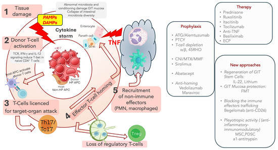 According to the pathophysiological three-step sequence proposed by Ferrara [31], several checkpoints can be targeted for prophylaxis of aGVHD: alloreactive T-cell depletion/inactivation, anti-homing compounds or anti-cytokine therapy; recently, the alteration of microbiota emerged as a pivotal driver of the GIT GVHD [34,51].