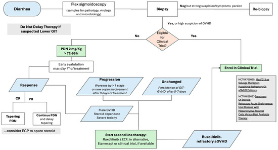 aGVHD of GIT presents both diagnostic and therapeutic-specific challenges (Figure 3). These patients should be carefully monitored for stool daily volume and to rule out infective agents such as Clostridium Difficile, Campylobacter, Cytomegalovirus (CMV), Adenovirus or Enterovirus. Upper endoscopy and flex sigmoidoscopy are strongly recommended [110]. However, the diagnosis of GIT aGVHD is based on clinical criteria and in those patients with suspected grade II–IV GIT aGVHD, it is recommended not to wait for histological confirmation and to check the eligibility of the patient for a clinical trial; if not, PDN at 2 mg/kg/day still remains the standard of care. Response to first-line treatment should be monitored daily: in case of worsening after 72 h or in the absence of improvement after 5–7 days, we suggest boosting the treatment (and checking again for clinical trial availability). In the case of CR, a quick steroid tapering (or a slow tapering, in case of partial response, PR) is encouraged; in our personal view, we consider the early association of Extracorporeal Photopheresis (ECP) in order to allow an easier steroid tapering, preventing possible flares and reducing the risk of infections [111].