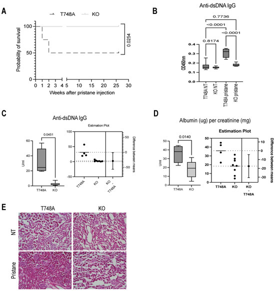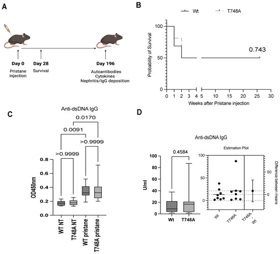 3.1. T748A Mice Exhibited Similar Survival Rate and High Titers of Autoantibodies Compared to Their Wt Littermates Following Pristane-Induced Lupus