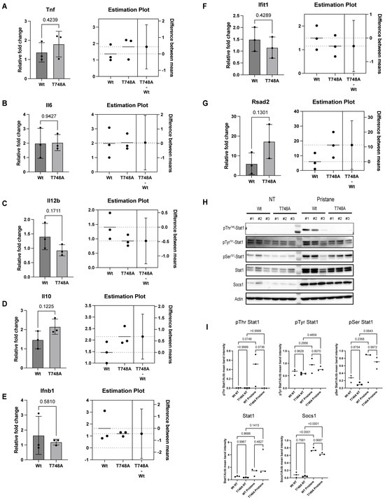 Thr748 phosphorylation is dispensable for Stat1-mediated cytokines expression and IFN signaling following pristane-induced lupus. (A–G) Splenocytes from pristane-injected Wt and T748A littermates. Total RNA was isolated, and the indicated transcripts were quantified by qRT PCR. Data are presented as medians (n = 3 biological replicates). (H) Splenocytes from naïve and pristane-injected Wt and T748A littermates. Whole-cell lysates were harvested and separated by SDS PAGE. The indicated endogenous proteins were detected by Western blotting analysis. Data show three independent biological replicates per genotype per group. (I) Quantification of mean band intensities of (H). p values are shown as measured by unpaired student’s t test with Welch’s correction (A–G) and one-way ANOVA with post hoc Tukey’s test (I). NT, non-treated.