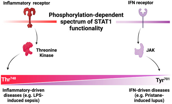 Stat1 is ubiquitously expressed and is comprised of a full-length α isoform and its splice variant β isoform, which lacks the last 38 amino acids of its TAD, suggesting a possible contribution of these amino acids to the specificity of the transcriptional activities of Stat1 [4]. The JAK-mediated Tyr701 phosphorylation of Stat1 is central for all types of IFN signaling and the transcription of IFN-stimulated genes (ISGs) [9]. Several post-translational modifications within the TAD contribute to the selectivity of the transcriptional activity of Stat1 following IFN stimulation [10,11,12,13]. In addition to its ubiquitous IFN signaling, STAT1 can also alter inflammation in a context-specific manner, yet the scope and mechanisms remain incompletely characterized. Our research has uncovered that Thr748 phosphorylation of STAT1 drives inflammatory responses while restricting IFN signaling in innate immune responses following lipopolysaccharide (LPS) stimulation [14,15]. The identification of Thr748 phosphorylation opens the door for exploring the combinatorial signaling logic within a single STAT protein, where different modifications, such as phosphorylation, modulate the protein’s output functions. This adds another layer of signal integration and regulation, achieving complex cell-specific and context-dependent responses.