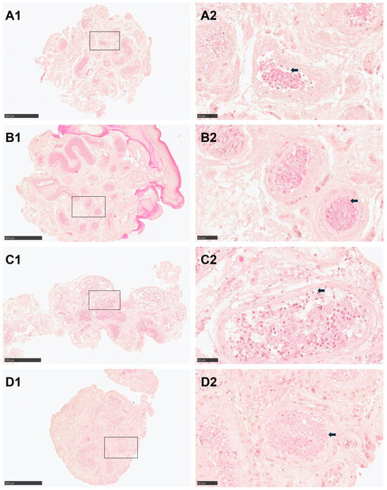 Hematoxylin-Eosin (HE)-staining of cryopreserved and in vitro cultured testicular tissue. (A1,A2) HE-staining of cells from Group 1 (quick thawing). (B1,B2) HE-staining of Group 2 (quick thawing and in vitro culture). (C1,C2) HE-staining of Group 3 (slow thawing). (D1,D2) HE-staining of Group 4 (slow thawing and in vitro culture). Bar for (A1–D1) = 500 μm, Bar for (A2–D2) = 50 μm. Black arrow indicates the space between basal membrane and cells in seminiferous tubules.