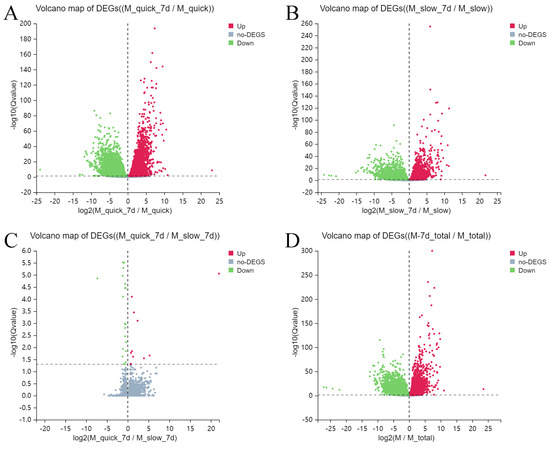 Volcano map showing differentially expressed genes (DEGs) between cryopreserved and in vitro cultured testicular tissue. (A) DEG volcano map: Group 2 cells (quick thawing and in vitro culture) vs. Group 1 (quick thawing). (B) DEG volcano map: Group 4 (slow thawing and in vitro culture) vs. group 3 (slow thawing). (C) DEG volcano map: Group 2 (quick thawing and in vitro culture) vs. Group 4 (slow thawing and in vitro culture). (D) DEG volcano map: Group 2 (quick thawing and in vitro culture) and Group 4 (slow thawing and in vitro culture) vs. Group 1 (quick thawing) and Group 3 (slow thawing).