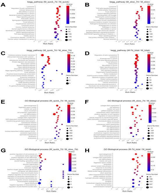 Bubble chart of differentially expressed genes (DEGs) displaying KEGG pathways and GO enrichment. (A) KEGG pathway chart from Group 2 (quick thawing and in vitro culture) and from Group 1 (quick thawing). (B) KEGG pathway chart of Group 4 cells (slow thawing and in vitro culture) and Group 3 cells (slow thawing). (C) KEGG pathway chart from Group 2 cells (quick thawing and in vitro culture) and from Group 4 (slow thawing and in vitro culture). (D) KEGG pathway chart of DEG in cells from Group 2 (quick thawing and in vitro culture) and Group 4 (slow thawing and in vitro culture) vs. cells of Group 1 (quick thawing) and Group 3 (slow thawing). (E) GO enrichment bubble chart for cells from Group 2 (quick thawing and in vitro culture) and Group 1 (quick thawing). (F) GO enrichment bubble chart for cells from Group 4 (slow thawing and in vitro culture) and Group 3 (slow thawing). (G) GO enrichment bubble chart for Group 2 (quick thawing and in vitro culture) and Group 4 (slow thawing and in vitro culture). (H) GO enrichment bubble chart for Group 2 (quick thawing and in vitro culture) and Group 4 (slow thawing and in vitro culture) vs. Group 1 (quick thawing) and Group 3 (slow thawing).