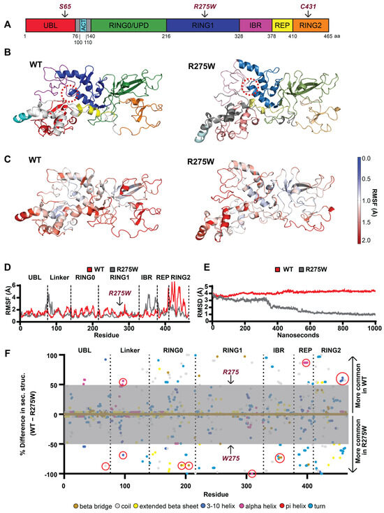 Structure of PRKN WT and p.R275W and conformational changes. (A) Schematic overview of the PRKN protein structure and individual domains: Ub-like domain (UBL, red), linker domain (gray), activating element (ACT, cyan), really interesting new gene domain (RING0, green), RING1 (blue), in-between-RING domain (IBR, purple), repressor element of PRKN (REP, yellow), and RING2 (orange). (B) A 3D model of the autoinhibited structure of PRKN WT and p.R275W with individual domains colored as in (A); the location of position 275 is highlighted by a red dashed circle. (C) A 3D heat map illustration of the root mean square fluctuation (RMSF) for PRKN WT and p.R275W over the course of the simulations. (D) Comparison of RMSF for each residue of PRKN WT (red) and PRKN p.R275W (gray). Domains are labeled and separated with dotted lines. (E) Root mean square deviation (RMSD) of PRKN WT (red) and PRKN p.R275W (gray) structure over 1 µs simulation. (F) Per-residue difference plot of the secondary structure averaged over the entire simulation and colored by secondary structure feature. Shown are percent occupancy times of each residue in a specific secondary structure for PRKN WT (top) and PRKN p.R275W (bottom). Differences greater than 50% (outside the gray area) are considered most meaningful. Secondary structure colors are indicated at the bottom of the figure.