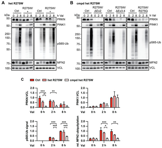 Biochemical analysis of PINK1-PRKN signaling in human fibroblasts with or without the PRKN p.R275W mutation. Dermal fibroblasts from controls and PD patients with heterozygous (A) or compound heterozygous (B) PRKN p.R275W mutation were treated with 1 μM valinomycin (Val) for 0, 2, or 8 h. Cell lysates were collected for Western blot analysis and probed with antibodies against PRKN, PINK1, pS65-Ub, and MFN2. VCL was used as loading control. (C) Densitometric analysis of PRKN and PINK1 Western blot signals normalized to VCL. Relative modification of MFN2 was calculated as the ratio of the upper (ubiquitylated) to lower (unmodified) MFN2 band. Quantification of pS65-Ub levels measured by sandwich ELISA. Data were normalized to control cells, either at the 0 or the 8 h time point. Data shown are mean ± SEM (n = 4 for WT, n = 2 for p.R275W heterozygous, and n = 3 for compound heterozygous). Statistical analysis was performed by two-way ANOVA followed by Tukey’s post hoc test (* p < 0.05, ** p < 0.01, *** p < 0.001). Only statistically significant comparisons are indicated.