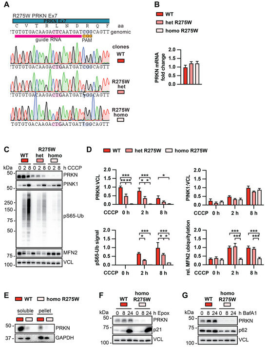 To investigate PRKN p.R275W in cells with the same genomic background, we generated isogenic clones with a hetero- or homozygous PRKN p.R275W substitution by CRISPR–Cas9 (Figure 3A). As a parental cell line, we used midbrain-derived neuronal precursors [39] that had been transduced with lentivirus to express mitochondrially targeted Keima red protein (mitoKeima), a mitophagy reporter [37]. Briefly, the same guideRNA targeting exon 7 of PRKN was used in both cases but was delivered with different ssDNA repair templates for insertion of the p.R275W substitution into one or both alleles. Cells were transfected and single clones were carefully screened for on- and off-target effects by Sanger sequencing. Per genotype, we confirmed three independent clones, and used them as biological replicates for functional analysis upon differentiation into dopaminergic (DA) neurons [37,39].