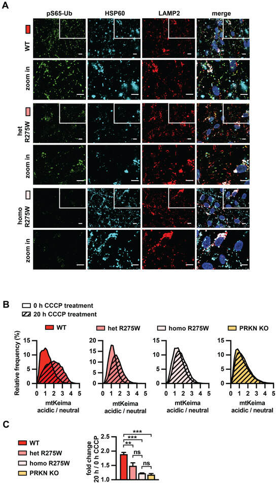 Analysis of PINK1-PRKN mitophagy execution in p.R275W isogenic cell lines. (A) Immunofluorescence imaging for gene-edited DA neurons. WT, p.R275W hetero- or homozygous cells were treated with 20 µM CCCP for 8 h. Cells were stained with antibodies against pS65-Ub (green), lysosomal marker LAMP2 (red), and mitochondrial marker HSP60 (cyan). Hoechst was used to stain nuclei. Scale bar = 10 μm. (B) Quantification of mitophagy in WT, PRKN p.R275W heterozygous or homozygous neurons, and PRKN KO using flow cytometry of mitoKeima. Representative frequency distribution of acidic/neutral mitoKeima in untreated cells and the shift that is observed after 20 h CCCP treatment (shaded) are shown. (C) Fold change of the acidic/neutral mitoKeima ratio at 20 h CCCP treatment compared to untreated cells for each cell line. Data shown are mean ± SEM (n = 3). Statistical analysis was performed via one-way ANOVA (** p < 0.01, *** p < 0.001, ns = non-significant).