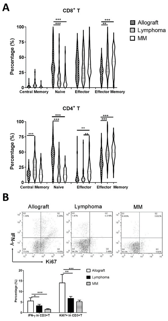 Characterization of T cells in the grafts. To evaluate the percentages of naïve, effector or memory T cells, fluorescence-labeled antibodies against CD45RA and CCR7 were added into the staining panel. To evaluate the proliferation and cytokine secretion of T cells in the grafts, sorted CD3+T cells from allografts and autografts were cultured for 5 days and then were stained with Ki67 to evaluate T cell proliferation, with fluorescence-labeled anti-IFN-γ for cytokine secretion. The expression of inhibitory receptors PD-1, CTLA-4, TIM-3, LAG-3, TIGIT and BTLA on CD4+T and CD8+T cells were evaluated by staining the graft cells using fluorescence-labeled antibodies. (A) Percentages of naïve, effector, central memory and effector memory T cells in the grafts. (B) The expression levels of Ki67 and IFN-γ in CD3+T cells of 10 allografts, 9 lymphoma autografts and 10 MM autografts. (C) The expression pattern of inhibitory receptors on T cells in the grafts. *, p < 0.05; **, p < 0.01; ***, p < 0.001.