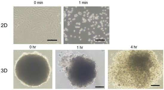 Trypsin digestion of 2D H9c2 cells and 3D H9c2 spheroid. Representative phase contrast images of 2D and 3D cultured H9c2 cells treated by 0.05% trypsin for different time periods are shown. Scale bar: 100 μm.