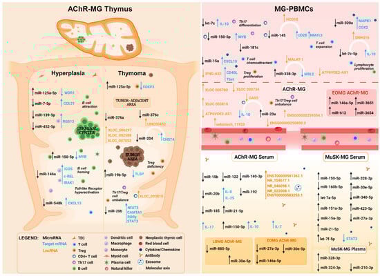 MicroRNAs, long non-coding RNAs, and related mRNAs known to be dysregulated in MG. A number of microRNAs (miRNAs, black), long non-coding RNAs (lncRNAs, orange), and related mRNAs (sky blue) were found to be dysregulated in the thymus, peripheral blood mononuclear cells (PBMCs), and serum/plasma of MG patients. Up- and down-regulated miRNAs are reported with arrows pointing up or down, along with implications of their dysregulation for T and B cell function and immune response (italics writing). MiRNAs, LncRNAs, and mRNAs interacting with each other and forming a molecular axis/triplet are represented with the semicircle. The left section illustrates ncRNAs, and some related mRNAs, altered in the thymus of AChR-MG patients, including hyperplastic MG thymuses, characterized by a germinal center presence in the thymic medulla, and MG thymoma, of which miRNAs are dysregulated in the tumoral area or in the normal tumor-adjacent area, are shown. The right upper and lower sections show molecules altered in MG PBMCs and serum/plasma, respectively. Boxes within these sections enclose miRNAs specifically altered in distinct disease subgroups, including early- (<50 years) and late- (>50 years) onset MG. NcRNAs altered in serum are subdivided according to the autoantibody status of MG patients (AChR- and MuSK-MG patients).