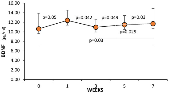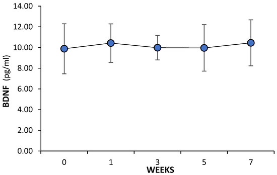 During the seven weeks of the study, BDNF levels in the control group did not change (Figure 2), while in the study group, BDNF increased compared to the initial value (week 0) (Figure 3). BDNF concentration at week 7 of the study was 11.75% (p = 0.03) higher than the value recorded in week 0. An increase in BDNF concentration was observed after the first week, when its value was significantly higher by 12.22% compared to the initial value (p = 0.05). In week 3, BDNF levels were significantly reduced by 11.65% (p = 0.042), compared to the value recorded in week 1, with no statistically significant differences from baseline. In week 5, BDNF concentrations increased from the value recorded in week 3 by 12.7% (p = 0.049). In week 7, further increases in BDNF concentrations were recorded compared to the value recorded in week 5. This was an increase of another 7.1% (p = 0.03). Between BDNF concentrations in weeks 3 and 7, statistically significant differences were noted (p = 0.029).