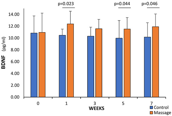 Statistically significant differences were found between the C and M groups in each of the weeks studied, except between weeks 0 and 3 (Figure 4). In week 1, BDNF was 15.7% higher in the massage group (p = 0.023), 20.7% higher in week 5 (p = 0.044), and 16.6% higher in week 7 (p = 0.046) (Figure 4).