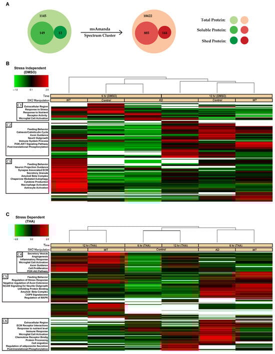 The secretome samples were analyzed by one-dimensional gel electrophoresis (1DE) and SYPRO-Ruby staining prior to mass spectrometry analysis. As anticipated, the buildup effect on the total secretome was noticeable at 12 h of ER stress induction. The differential expression of some secreted proteins could even be spotted on the gel by the naked eye (Supplementary Figure S1C). We detected 1306 total proteins that matched the Mus musculus protein databank with an FDR above 0.05 and a confidence interval ranging from medium to high. Among these proteins, 149 were soluble secreted proteins, 12 were shed proteins, and the rest were intracellular proteins. To detect low-abundance proteins, we used msAmanda and spectral clustering, which led to the identification of additional proteins, resulting in a final list of 885 soluble and secreted and 144 shed proteins (Figure 2A). Based on the LFQ abundance intensities, a heatmap was constructed, and subsequently, we applied clustering methodology to these 1029 proteins whose secretion were either increased or decreased together with respect to the SIK2 and ER stress variables. These hierarchical clusters of the POMCs secretome presented on the heatmap indicate differentially regulated proteins affected by SIK2 availability in the background of 6 and 12 h of ER stress conditions to differentiate the early and late response proteins relative to control in the secretome, respectively (Figure 2B,C). In the absence of ER stress, SIK2 overexpression produced the most significant (≥2-fold) increase in a group of related proteins (cluster 3) compared to SIK2 knockdown or control cells (Figure 2B). However, in response to 6 h of ER stress induction, significant increases of at least two-fold in the secreted proteins listed in clusters 5 and 6 were detected in SIK2 knockdown cells compared to both control and SIK2 overexpression. That is, ER stress-mediated SIK2 activation in POMCs suppresses the level of these proteins, especially during the early phase of ER stress response (Figure 2C). The comparative analyses of heatmap clusters revealed that SIK2 plays a pivotal role in regulating the secretion of proteins, particularly in the extracellular matrix, immune response, axon guidance and neurite outgrowth, and feeding behavior-related terms and pathways. These findings were exclusively observed in the early phase (6 h) of the ER stress response and appeared to be discharged from this duty by the implementation of late (12 h) ER stress. Although the observed fluctuations between the 6 h and 12 h time points in the control group in the absence of stress may be attributed to the potential effects of serum starvation, there are no statistically significant differences calculated according to LFQ-based analysis. On the other hand, the data showed that the proportion of differentially secreted proteins showing an increase at the 6 h time point was greater than that observed at the 12 h time point for both SIK2 knockdown and overexpressing cells compared to the control (Supplementary Figure S2). For example, SIK2 overexpression produced a broader (~70%) yet contrasting incremental effect on these secreted proteins in clusters under no-stress conditions (Supplementary Figure S2C). Taken together, the data presented suggest that the effect of SIK2 on the POMC secretome is limited to the early phase of the ER stress response and is manifested by its ability to suppress various biological processes.