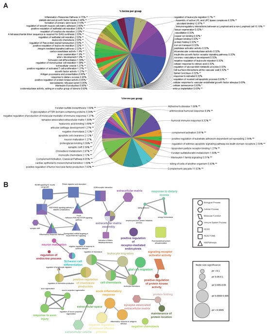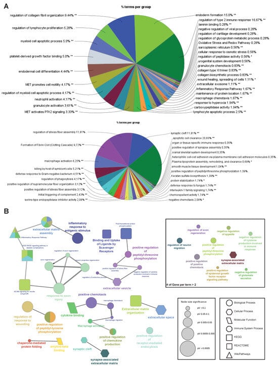 Stress-independent functional enrichment analysis of the SIK2-modified POMC secretome. (A) Pie charts generated by ClueGO and CluePedia showing the Gene Ontology terms and pathway analysis belonging to Cluster 2 (top) and Cluster 3 (bottom) with the percentage of terms/pathways per associated gene group. (B) Network analysis of selected functionally grouped terms/pathways. Each node represents a GO term/pathway, and the node size refers to the p-value, represented by a different node shape for each database (see legend for node size and shape). The edge represents the connection between the functionally related processes (according to kappa statistics). The different colors within the same node refer to the percentage of genes that were significantly enriched within the term belonging to the different groups. * p < 0.05, ** p < 0.01.