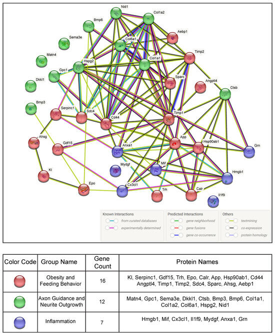 A list of POMC-derived secreted proteins regulated by SIK2 during the early phase of the ER stress response was directly uploaded to STRING software (v.3.7.6) for protein–protein interaction (PPI) network analysis (Table 2). A network of PPIs among functionally related proteins was visualized along with their functional annotations with reference to experimental or database-predicted information. STRING analysis revealed both inter- and intraconnections between the members of the three distinct gene groups obtained from the functional enrichment analyses, and the genes depicted in the PPI network are listed in the table below (Figure 5). Notably, PPI network analyses revealed an intricate interaction network between the members of three functionally related groups, accounting for their coregulation by SIK2, presumably downstream of the unfolded protein response (UPR), in ER-stressed POMC neurons. For example, the stress alarmone and anorectic protein Gdf15 interact with members of two other groups, including inflammatory Cx3cl1, axon guidance-related protein (Bmp3), and the obesity-related proteins Timp1 and erythropoietin (Epo). Concerning Timp1, a shed protein implicated in the inflammatory response plays a central regulatory role at the crossroads of protein–protein interactions between obesity-related proteins and feeding behavior-related proteins (Gdf15, Cd44, Sparc, and Angptl4) as well as axon guidance-related proteins (Ctsb, Hspg2, Col1a1, and 2) and neuroinflammation-related proteins (Cx3cl1, Anxa1, and Mif). We also found that cathepsin B (Ctsb), a lysosomal cysteine protease involved in protein turnover and proteolytic processing of amyloid precursor protein (APP), interacted with obesity- and feeding behavior-related proteins Calr, App, Hsp90ab1, Timp1, and Timp2 and inflammation-related Hmgb1 and Grn (Figure 5). Although APP is predominantly linked to the pathophysiology of Alzheimer’s disease, a recent report pointed out its association with obesity phenotypes such as insulin resistance and inflammation, which are regulated by tumor necrosis factor α (TNF-α) [,]. We provided an extended and targeted evaluation of these PPIs in the discussion.