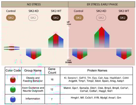 In addition, the secretion of axon guidance-related proteins, namely, perlecan (Hspg2), dickkopf-like protein 1 (Dkkl1), cathepsin B (Ctsb), matrilin-4 (Matn4), and nidogen-1 (Nid1), were induced collectively in the secretome of SIK2-depleted cells in response to early ER stress induction, and similar to SIK2 overexpression in feeding and obesity-related group, SIK2 overexpression increased the secretion of these proteins in a stress-independent manner, except for Dkkl1. In contrast to the general trend of other members of the group, the Dkkl1 level decreased with SIK2 overexpression during the early ER stress response (Table 2, see the axon guidance and neurite outgrowth group, green colored).