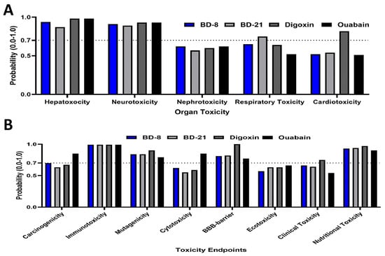 In silico toxicity prediction of BD-8 and other cardiotonic molecules. (A) Probability of organ toxicity determined by ProTox3.0. (B) Probability of toxicity endpoints determined by ProTox3.0. The dashed lines represent the 0.70 probability cutoffs.